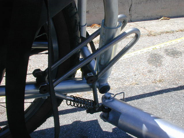 Hitch from L side of bike. The spring is non functional, it served only to carry the allen key. All flex is in the U joint where the trailer spine terminates. It is a good sturdy mechanism.