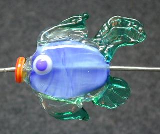 The tail fin is also a bit clumsy, but the overall fishy look is improving. I wish orange glass would stay orange long enough to make a fish, but they take long enough to made that most orange/red transparent colours would smoke and liver out before the piece was done.