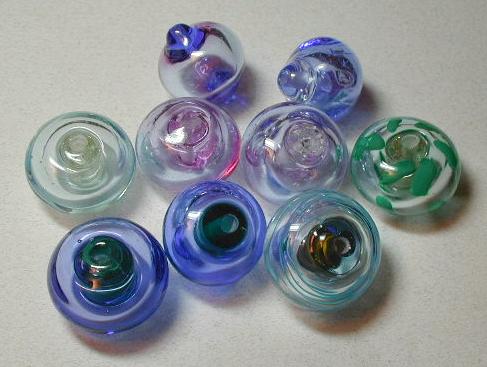 This is a group portrait of several hollow beads. They got better as I kept at it :-) The last couple are actually pretty smooth and regular, and I stopped building on cones and managed smooth ends. I used three kinds of glass for the outer shells: clear (actually very pale aqua), sky blue transparent, and alexandrite (czech). The cores vary. The two beads at the back have no axle -- they are entirely hollow. The other beads all have an axle. This makes them a bit easier to clean :-)