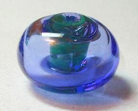 The axle of this clear blue hollow bead is a spiral of turquoise filigrana. It's rather dark inside the blue bead and so the axle isn't very showy. Also the ends got a bit damaged -- a long story -- the bead release separated from the mandrel and it was messy.