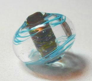 The walls of this hollow bead were partly built of VPA and partly of turquose filigrana -- thus the thin stripes. The core was a bad choice -- yellow, red, blue and clear in swirls. Of course the red cooked out during the long working time, and turned a nasty reddish brown.