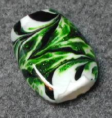 This is a fairly large (pendant size) bead of white opaque glass with a sparkling green aventurine raked pattern. The design is of course different on each side. The tiger stripe effect turned out pretty well.