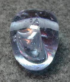 The pale lavender colour of this pendant is not showing up in the light I used in this shot. It is made of Heidi's Mystery Glass and it is the end product of a disaster. I was trying to blow a hollow form, and it blew out repeatedly. Eventually I gave up because the bead release with which I had coated the blowpipe was giving up. I scraped the unpolluted glass off the tube and made it into a pendant with a big asymmetrical bubble. If you didn't know the story, you might think it was kind of cool, though the glass does show signs of rough handling.