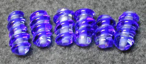 I seem to have forgotten how to make matching pairs! All these blue spirals and no two close enough to make earrings. Once again the camera demonstrates how it can warp shades of blue. These were cobalt over clear. Where those magenta highlights came from I have no idea.