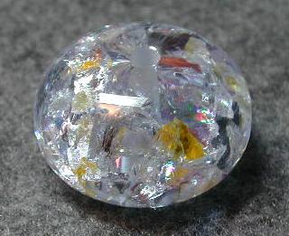 Here chunks of CZ were embedded in large plain clear core. But not deeply enough, and too much. It fractured badly. If it had not fractured I think the effect would have been fairly pleasing, like clear water over shiny stones. But it's a disaster. The moral of the story is, don't overdo it with CZ. If you either put too much in the bead, or get it too close to the outer skin (not sure which yet), the whole thing will fracture during annealing.