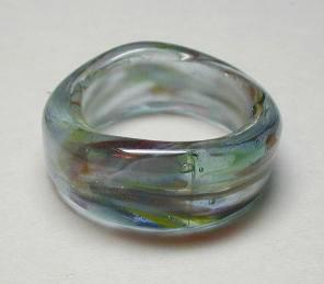 This ring was made by picking up mille offcut frit in a clear gather, melting it in, and then building the ring with the gather -- the miscellaneous shards of opaque in the clear matrix stretched out into smoky veils. This ring is one of the better ones for overall appearance and smoothness, but wouldn't you know it -- the darned thing cracked on one side. It's still holding together but I don't trust it.
