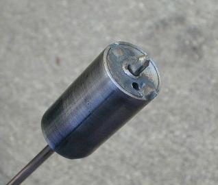 Here is the "business end" of the assembly, showing how the drum is attached: the mandrel has been hammered flat, and the drum then hammered lightly down onto the flattened region at the tip, which binds tightly and holds the drum in place. This crude method of attachment is actually very effective. The drum is firmly affixed and will not spin or slide.