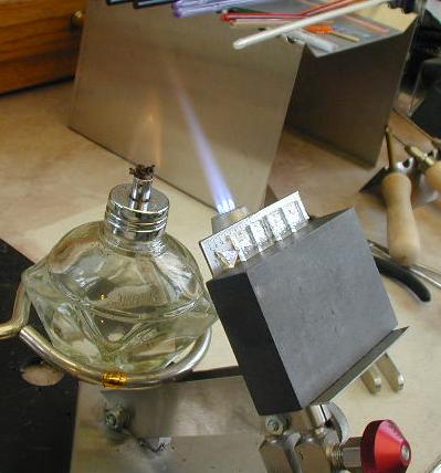 This is a recent bright idea for keeping Italian glass happy. I thought, "Why not have an alcohol flame just below the main torch flame?" This would warm up the air below the big flame (it can get chilly at my workbench in winter) and maybe keep larger pieces happy. It would also serve to pre-heat bits and pieces. I happened to have a lab stand and a lab lamp lying about, so I gave it a try.