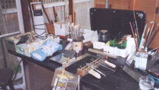 This is another angle on the original workbench setup with the Hot Head. Note the mini electric handwarmer (blue thing to the left) ready to slip over the tank to keep it from chilling down. Ah, the things I don't miss about that Hot Head.