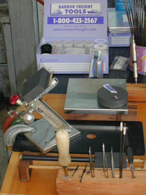 Side view of the interim bench, just after the Hot Head was replaced by the Minor Burner... what a blatant plug for Harbor Freight! Sorry about that; but those little cardboard boxes they sell, never mind the advertising, are very useful.