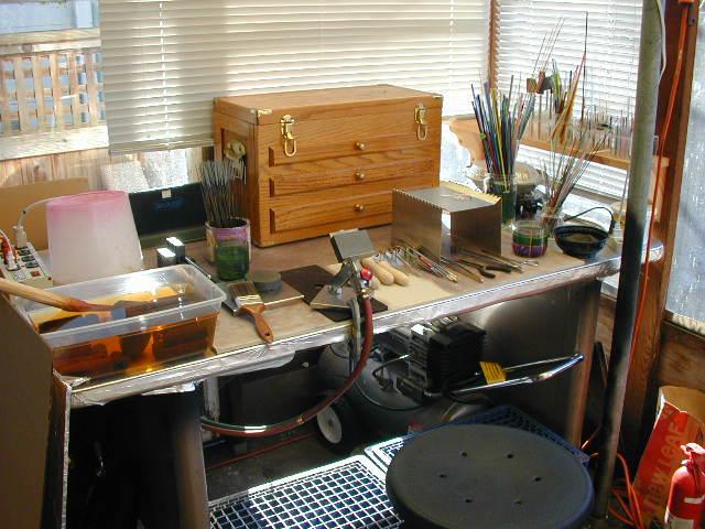This version of the workbench was current in Spring of 2001. The wooden marble molds have left their steel stockpot and now live in a plastic "swimming pool" which you see on the left of the bench. The tools are about the same, but there is more glass :-) and the incidental tools and supplies are now living in my old wooden tool chest.