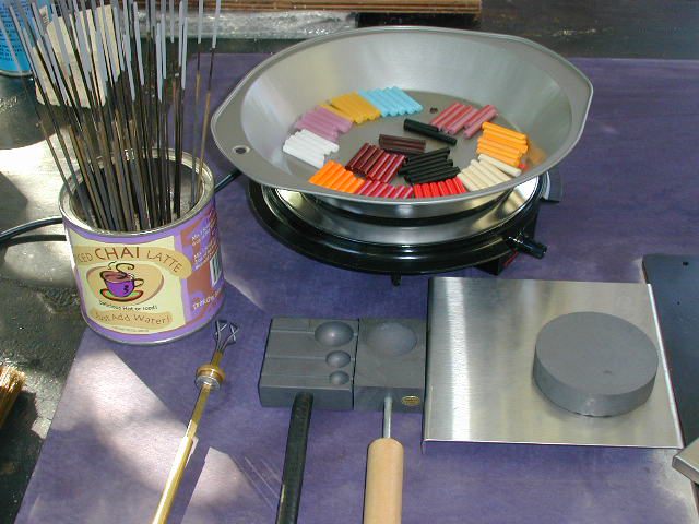 The Left Hand End of the bench showing the marvering pad, marble molds and stuff. There are two graphite marble molds and a Hot Fingers tool lying next to the marver pad. The "logs" are heating up in a pie pan sitting on an ordinary electric burner.