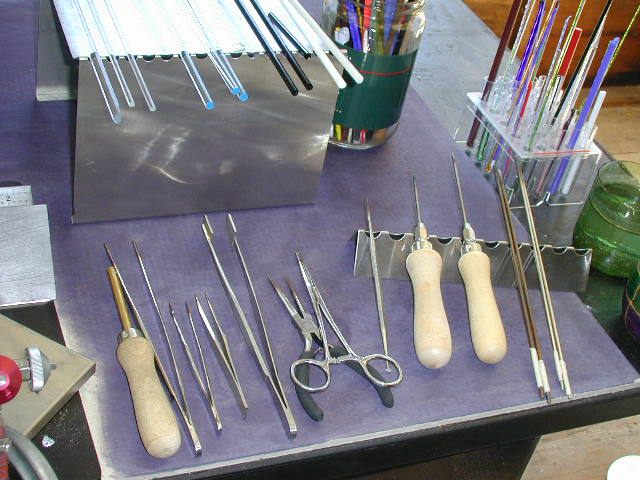 The tools: some tweezers, hemostats, needlenose pliers, a dental tool, two tungsten rakes (one straight, one bent), and the metal pontils aka pointy mandrels. The water jar is just the butt end of a wine bottle that I cut off.